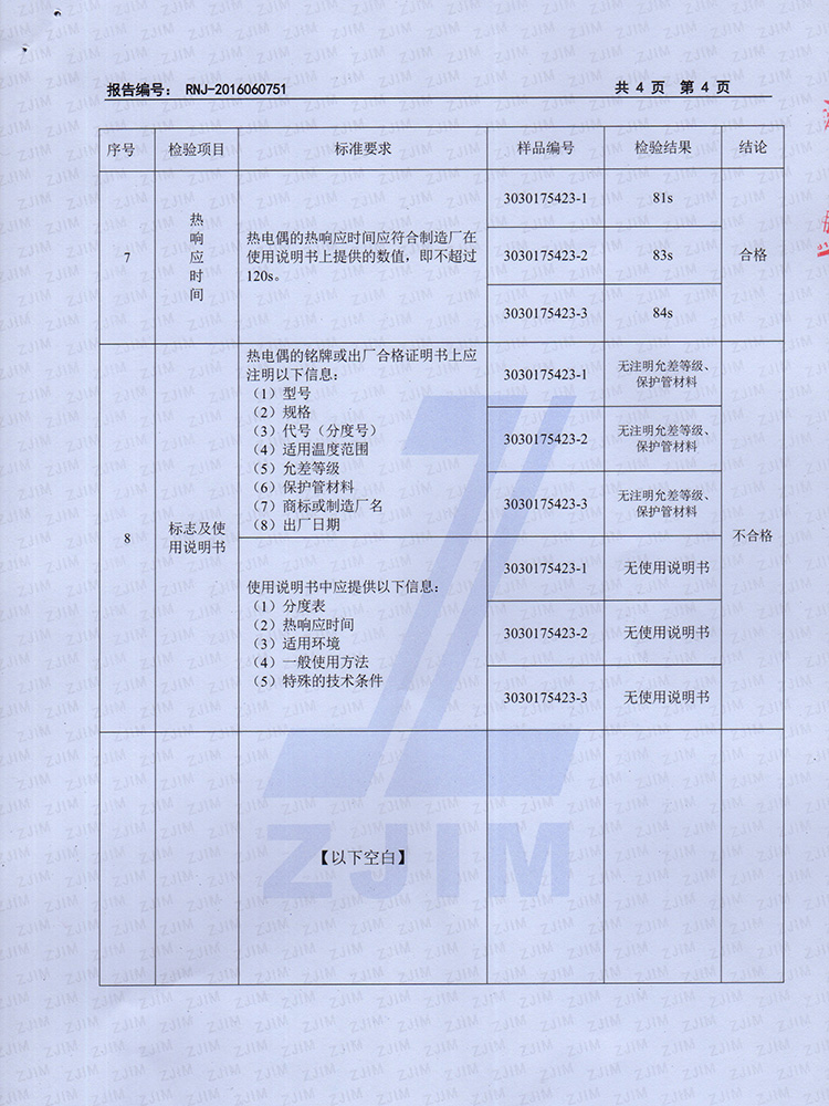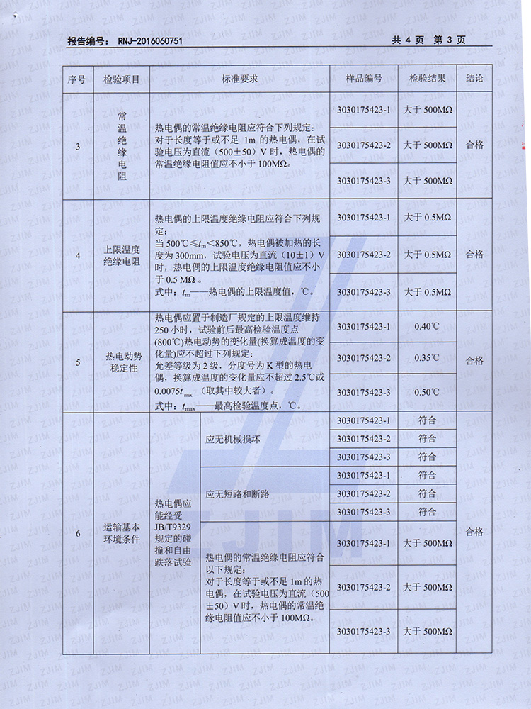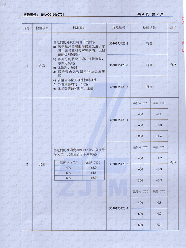 2016年工業(yè)熱電偶檢驗(yàn)報(bào)告